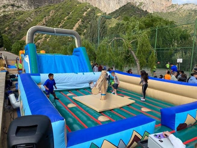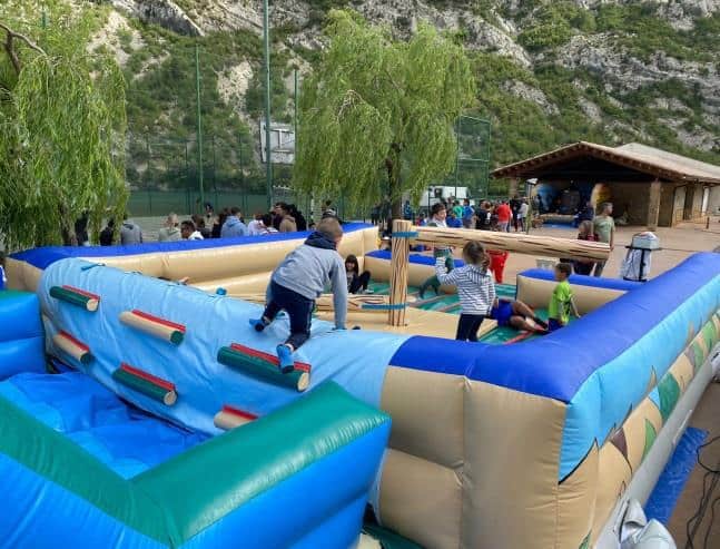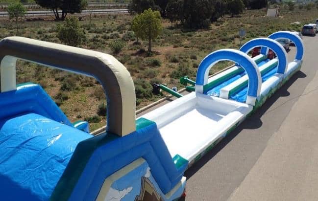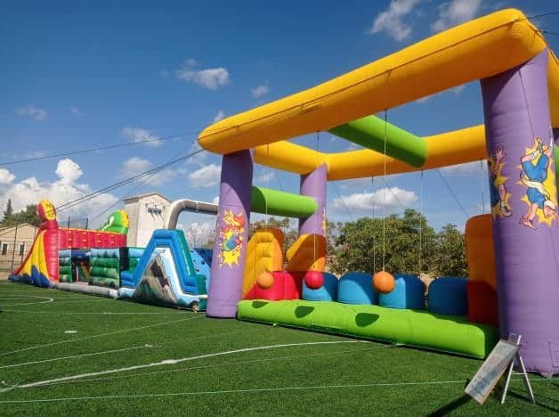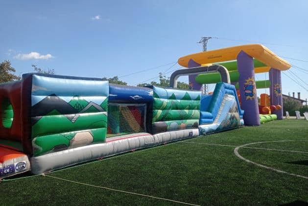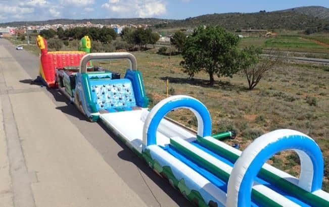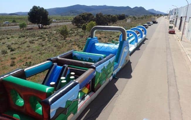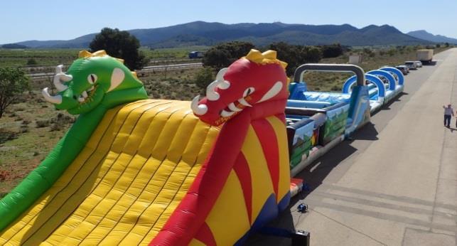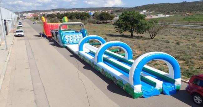 Impresionante pista americana con multitud de obstáculos, hasta cuatro toboganes, una barredera con diferentes velocidades y direcciones de giro, dos zonas de escalada, una gran piscina, zona de deslizamiento, con hinchable Guara o con Tamara. Con o sin agua, para verano o invierno. Desde los 15 y hasta los 70 metros de longitud con una altura máxima de 7,5 metros. Montaje longitudinal, en forma de L, en cruz y en el orden que prefieran o mejor se adapte al lugar donde quieran realizar la actividad. El sueño de todo gran niño, ahora disponible por módulos de distintas dimensiones para adaptarnos al lugar de realización, época del año, presupuesto, etc. No se quede con la duda y consúltenos.