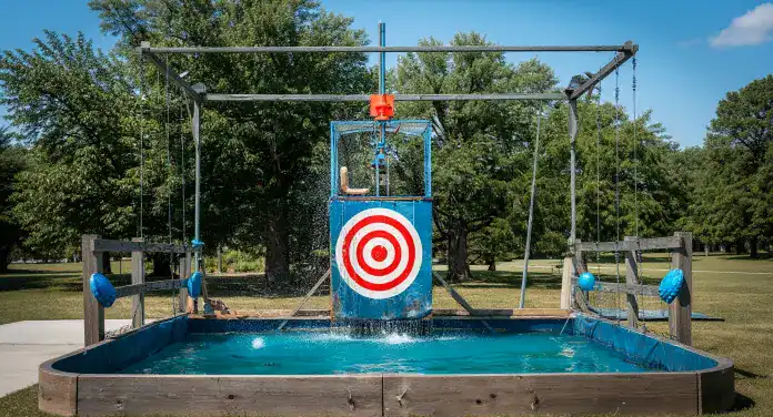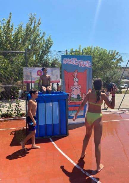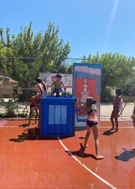 Un tanque lleno de agua, acompañado de una plataforma móvil, al que se le suma una diana y una pelota, DUNK TANK!! Juego americano para esos días de calorcito.